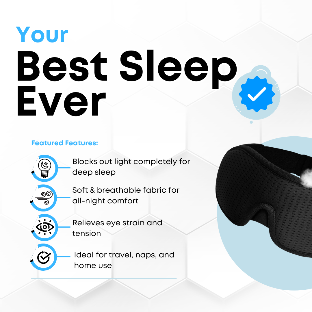 Experience the ultimate sleep with our breathable sleep mask. Designed to block out light completely, it helps you fall asleep faster and enjoy deeper, more restorative rest. Sleep is essential for your health, energy, and mood—and this mask makes it effortless. Made from soft, breathable fabric, it keeps you cool and comfortable all night long. Whether at home, on a plane, or traveling, this sleep mask is your perfect companion for uninterrupted sleep.
